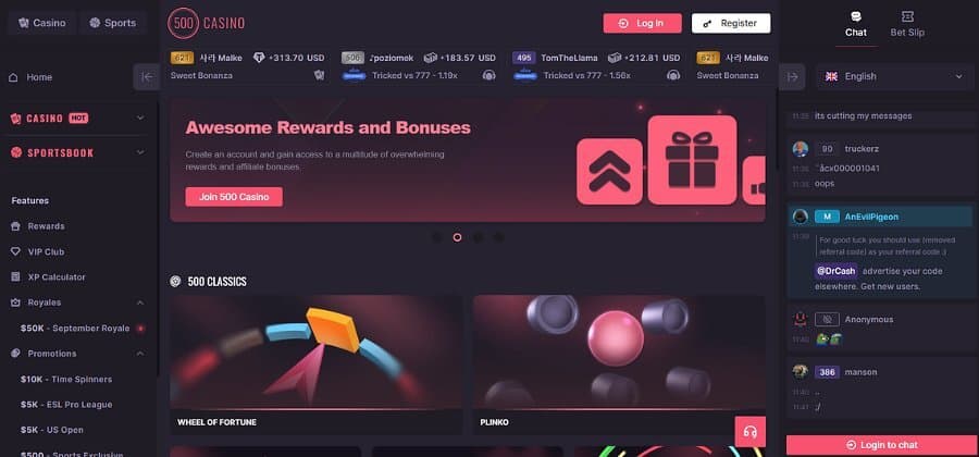Some games now being launched at 500 Casino are the slots Chilli Heat Megaways, Gates of Olympus, and classics like Wolf Gold and The Dog House. From the live casino portfolio, players can enjoy timeless games such as blackjack and roulette, as well as the recently released innovative Boom City.