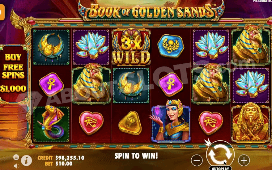 Book of Golden Sands is a new casino slot from Pragmatic Play where we visit the ancient Egypt in search of hidden treasures. The fact that this theme is a favorite of this game provider has hardly gone unnoticed, where over the years we have been able to enjoy games such as Cleocatra and Fortune of Giza. This time we are treated to a gaming experience where the "Book of" mechanic has been applied, but where it has been given a peculiar touch that makes it all extra exciting. During the spins you can win up to 10000X the bet, which is twice as much as their otherwise standard value of 5000X.