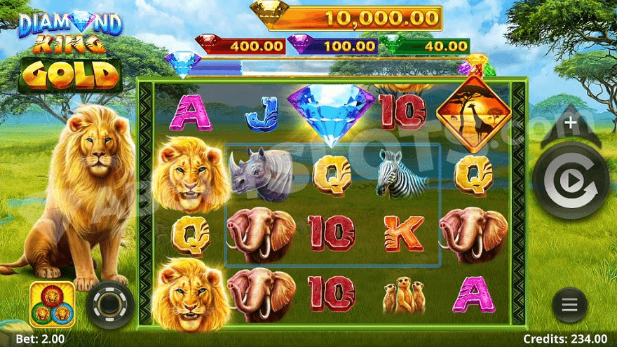Diamond King Gold is a new casino slot from Spinplay Games set on the African savannah. Diamonds do take a big part of this journey as they’re the game’s wild symbols. However, the reel king of this exotic adventure is a lion, being the highest paying symbol. The lion can also start the Roar feature, awarding up to 5X multipliers for every wild symbol that lands on reels 2, 3, and 4. Moreover, you can collect golden lions in the free spins to upgrade symbols. If that wasn’t enough, Diamond King Gold has a Jackpot feature that is triggered by collecting wild diamonds, paying up to 5000X the bet.
