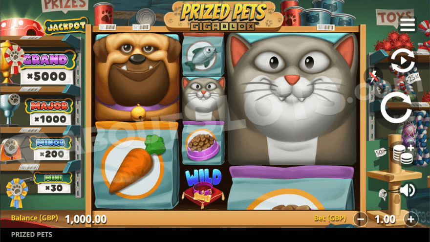 Prized Pets Gigablox is a new casino slot from Northern Lights Gaming where we wander into a local pet store filled with welcoming animals. Similar to what we've seen before in the movie The Secret Life of Pets, these animals also come to life for real when their owners are away. Dog House Megaways is one of all the animal-themed slots created in the past that has really found a place close to the heart of many players, with its colorful and entertaining elements resulting in this. This time around, a festive theme decorated with bright colors has been created once again, so let's visit this slot and find out what you can expect to see during the spins.