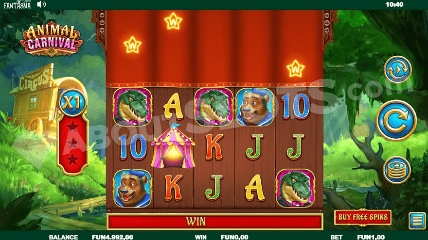 Animal Carnival is a new casino slot from Fantasma Games with a bunch of animals running a circus. You’ll find apes, bears, crocodiles, and other animals in this mix. The reels have 3 regular rows and 3 extra rows on the top, showing wilds and other special symbols behind a red curtain. Those symbols drop down on the reels during avalanches, which occur every time you make a win. Speaking of making wins, Animal Carnival pays both ways, meaning a winline can start both on the first and last reel from the left. Landing wilds also add up on a multiplier that is used with the total win after a series of avalanches.