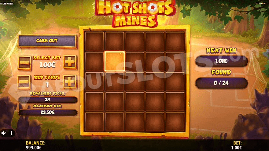 Hot Shots: Mines is a new casino slot from iSoftBet with the same pick & click-setup as in Aztec Gold: Mines och Gold Digger: Mines. The game takes place at the Hot Shots stadium, where animals face each other on the soccer field. But instead of spinning the reels like in Hot Shots Megaways, the player picks golden footballs hidden under the grid’s 25 positions. There are also between 1 and 15 red cards hidden behind the positions, and the player’s job is to avoid them because just one red card is enough to lose the game. How many footballs do you dare to collect before cashing out your win?