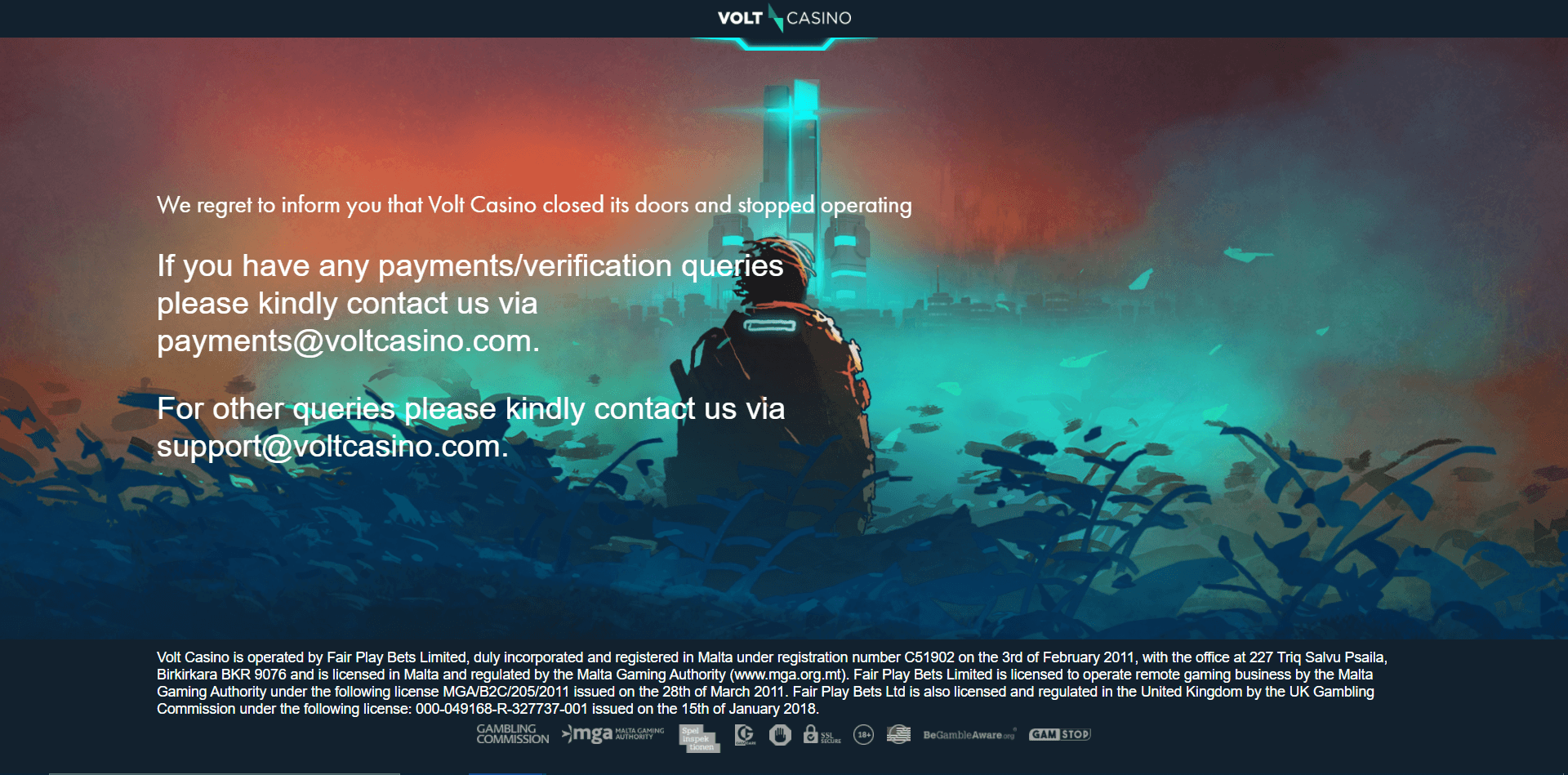 Fair Play Bets Limited, which owned Volt Casino, has had its MGA license voluntarily suspended too and has closed down its casino. If you’d like to check for updates on the MGA website, here’s the company’s license number: MGA/B2C/205/2011