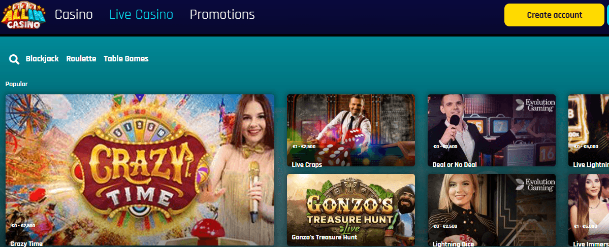 Unfortunately, the live casino section at All in Casino is somewhat limited, so not all games are available. While Live Blackjack and Live Roulette tables are available in abundance, the same cannot be said for Baccarat, Craps and Poker. These games are only available in one variation.