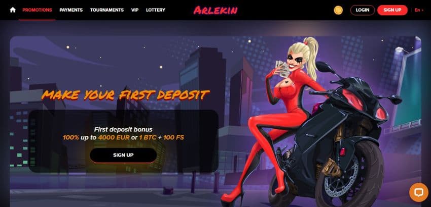 Arlekin Casino's Welcome Bonus ranks as one of the best casino signup bonuses in the online gaming industry. It is spread across the first four deposits you will make on the platform. This casino bonus offers you up to €5000 plus 150 free spins or 1 BTC for Crypto players.