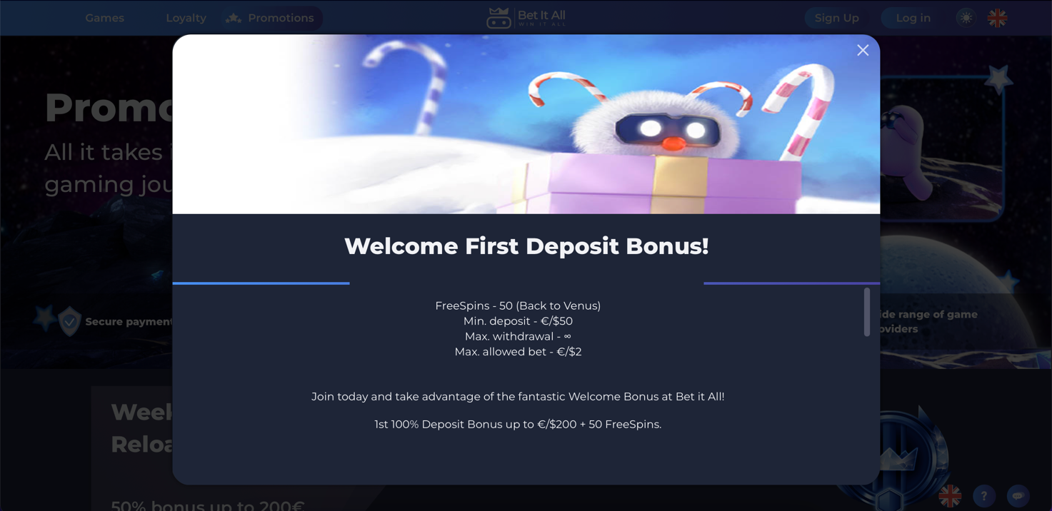 Welcome to Bet it All Casino, where excitement meets generous rewards! New players can kickstart their gaming journey with an enticing Welcome Bonus package. This offer includes a substantial 100% match bonus on your first deposit, up to a maximum of €200, and 50 Free Spins on the thrilling Back to Venus slot. To unlock this bonus, a minimum deposit of €50 is required. Please note that only one deposit of €50 or more will activate the bonus.