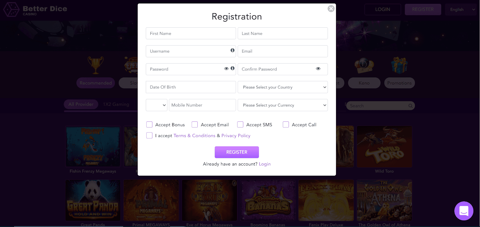 On the top right corner of Better Dice Casino's home page, you'll be able to log in, Register, and select your preferred language, while on the bottom right, you'll find the button which will connect you to the live-chat operators.