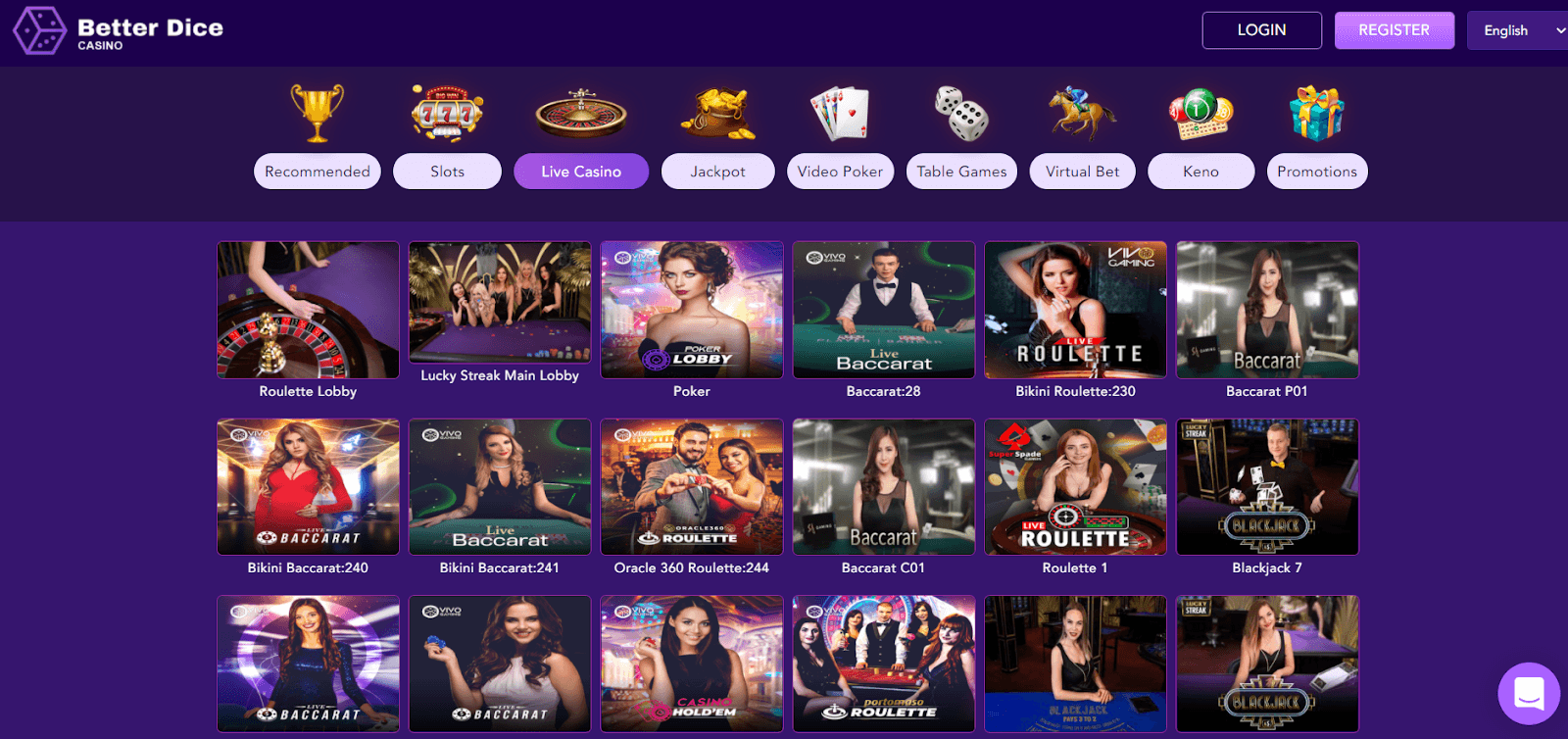 Enjoy blackjack, roulette, poker and many more games that you'll find at Better Dice live casino!