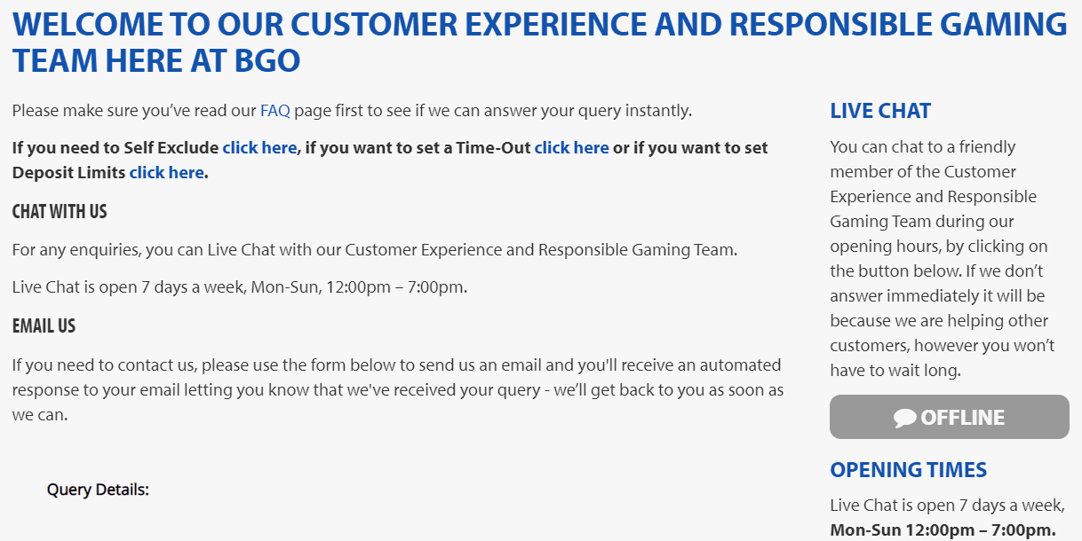 The customer service at Bgo Casino is limited to a total of 2 contact options. In general, inquiries can only be processed by e-mail. There is no telephone hotline, and the live chat is available seven days a week, Mon-Sun, 12:00 pm – 7:00 pm.