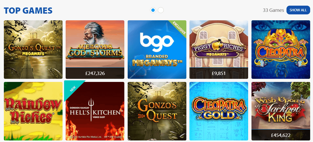 Some of the most famous slots you’ll find on this platform are Age of the Gods, Gonzo’s Quest, Piggy Riches, Rainbow Riches, Hell’s Kitchen, and many more great slots.