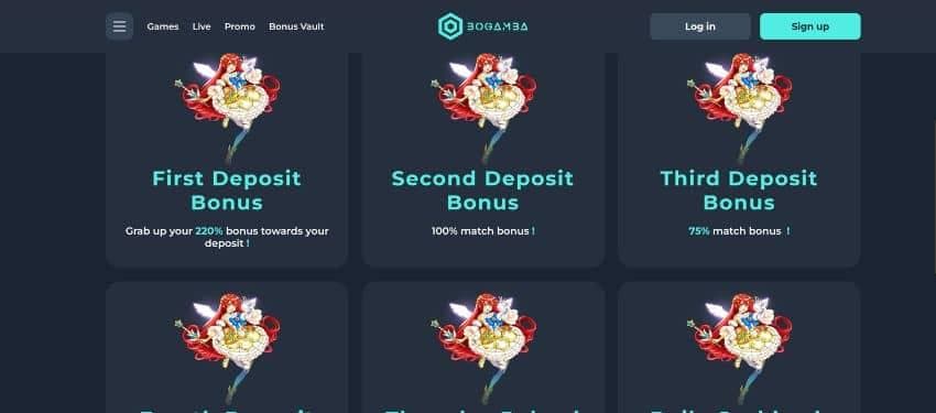 Bogamba casino has a generous collection of casino bonuses for new and existing players. The crypto-friendly casino also has a bonus vault hosted on Telegram, where players can get unique reward updates. There is no mention of a Bogamba casino no-deposit bonus code on the promotions page. However, you might find some free spin offers in the casino's bonus vault. Currently, the rewards available on the casino promotions page are deposit bonuses, reload, and Thursday bonus offers. Here is an overview of the different rewards