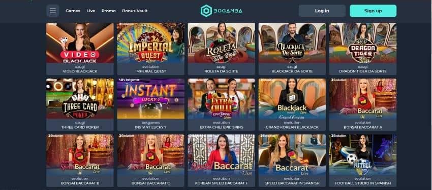 Some live dealer games you can play at Bogamba Casino are "Spanish Roulette", "Funky Time", "Dragon Tiger", "Three Card Poker", "Instant Lucky 7", "Speed Baccarat", "Football Studio", and "Mega Ball in Spanish".