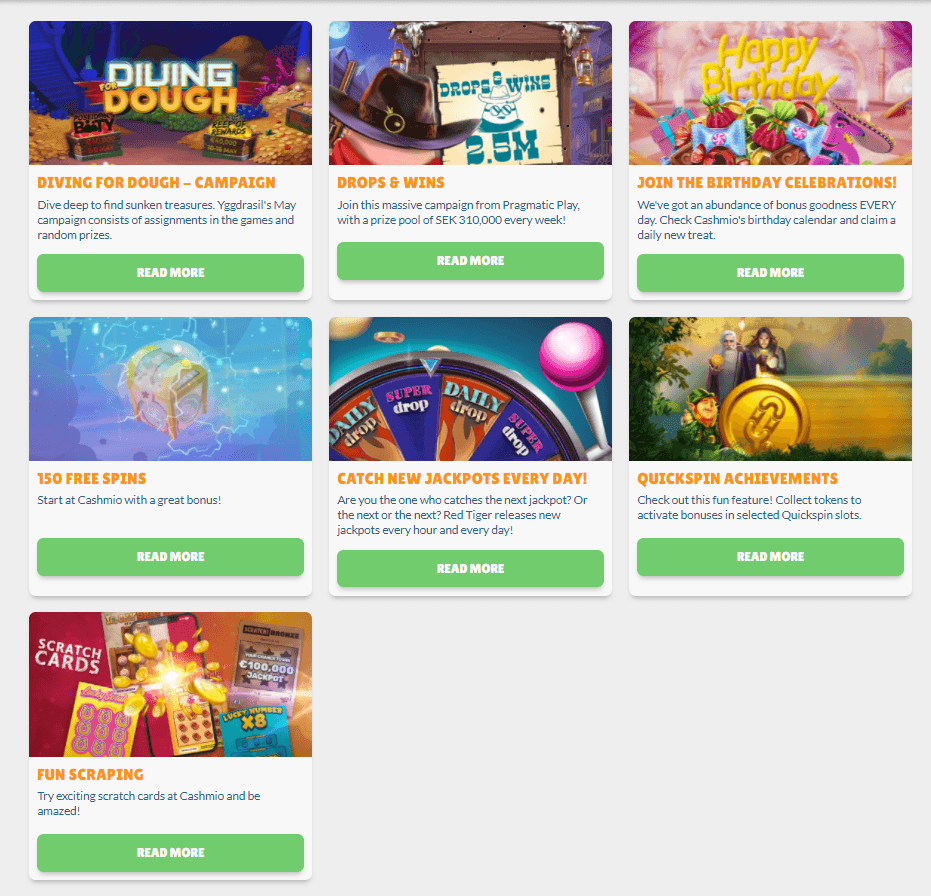 Cashmio Casino offers many different bonuses, such as tournaments, free spins, daily jackpots, and scratch cards promos, as well as an interesting welcome casino bonus.