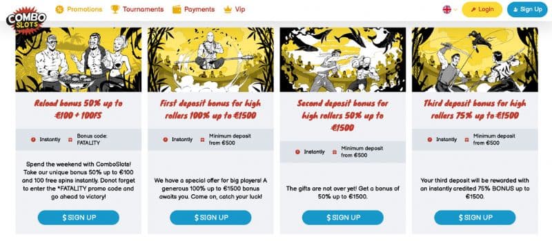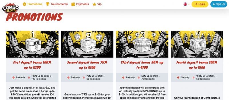 New players to Combo Slots Casino can claim a 100% bonus up to 200 euros and 100 free spins on their first deposit. You can also claim a bonus on your second, third, and fourth deposits.