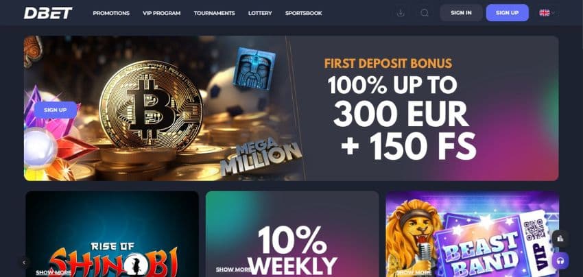 Dbet Casino's welcome bonus is worth 100% of your first deposit up to €300 plus 150 free spins.