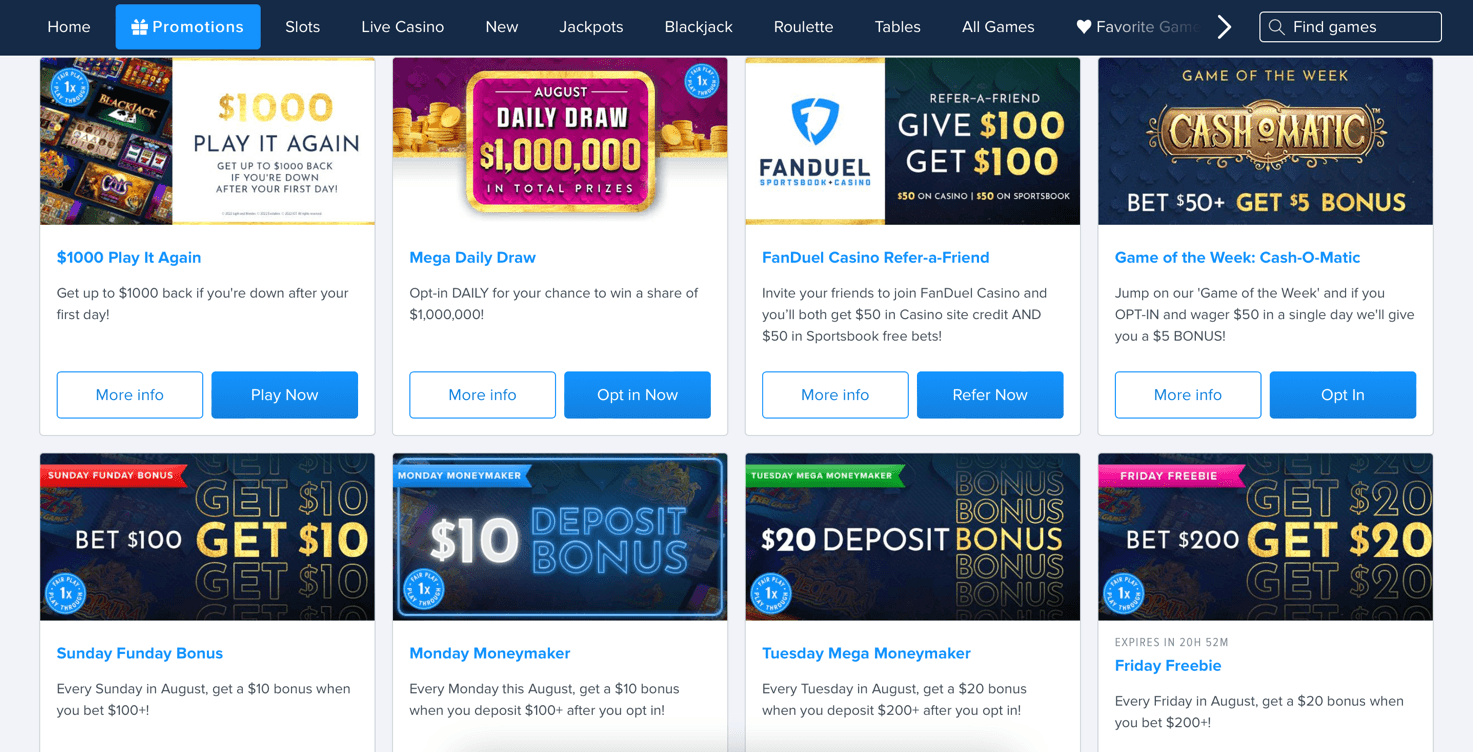 FanDuel Casino has a busy promotions page that is loaded with balance-topping extras. You can keep your balance nice and healthy throughout the week, with a wide choice of reload bonuses, refer-a-friend perks, daily prize draws, and more. It’s worth checking out the page to see if there are any new additions to the promotional arsenal. What’s more, make sure you’re signed up to receive the marketing emails, because plenty of bonus offers will land in your email inbox.