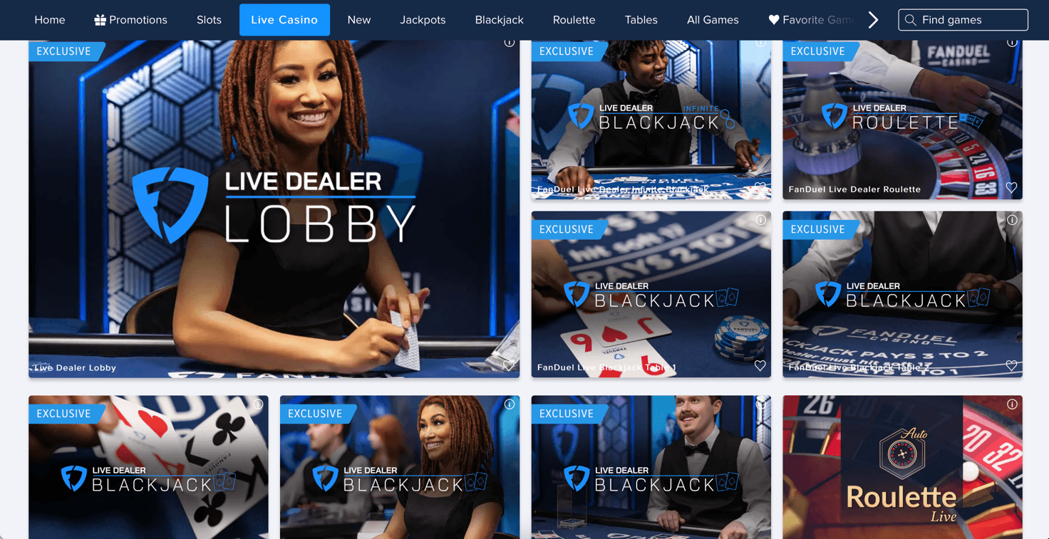 At FanDuel Casino you will find a decked out live dealer lobby that offers blackjack, roulette, poker, baccarat, game shows and other live games.