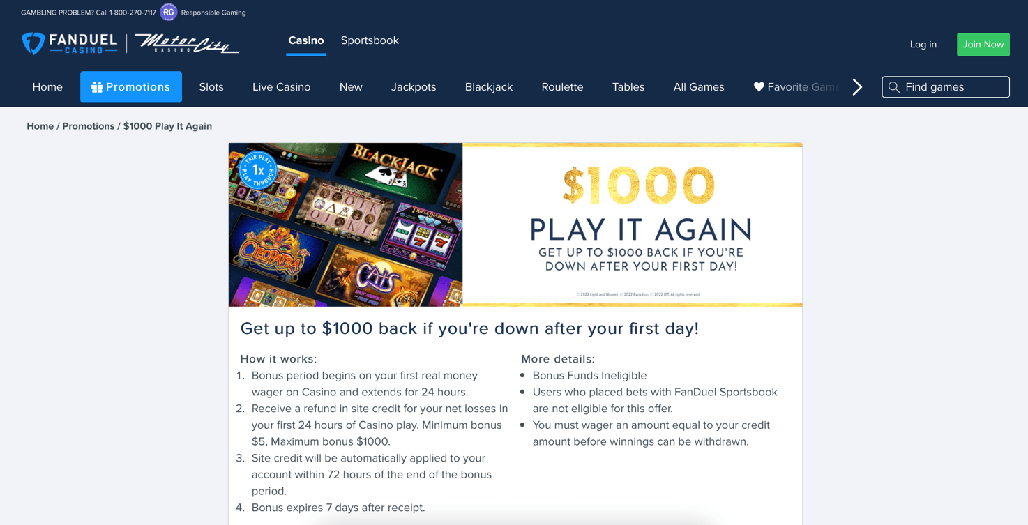 New players to FanDuel Casino can claim up to 1,000 dollars in losses on their first day as a player.