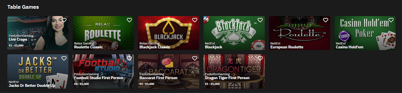 Furthermore, you’ll find games such as Football Studio and Dragon Tiger. There are, in total, ten games, which is obviously quite a low number if compared to many other online casinos, which offer hundreds of table games’ versions.