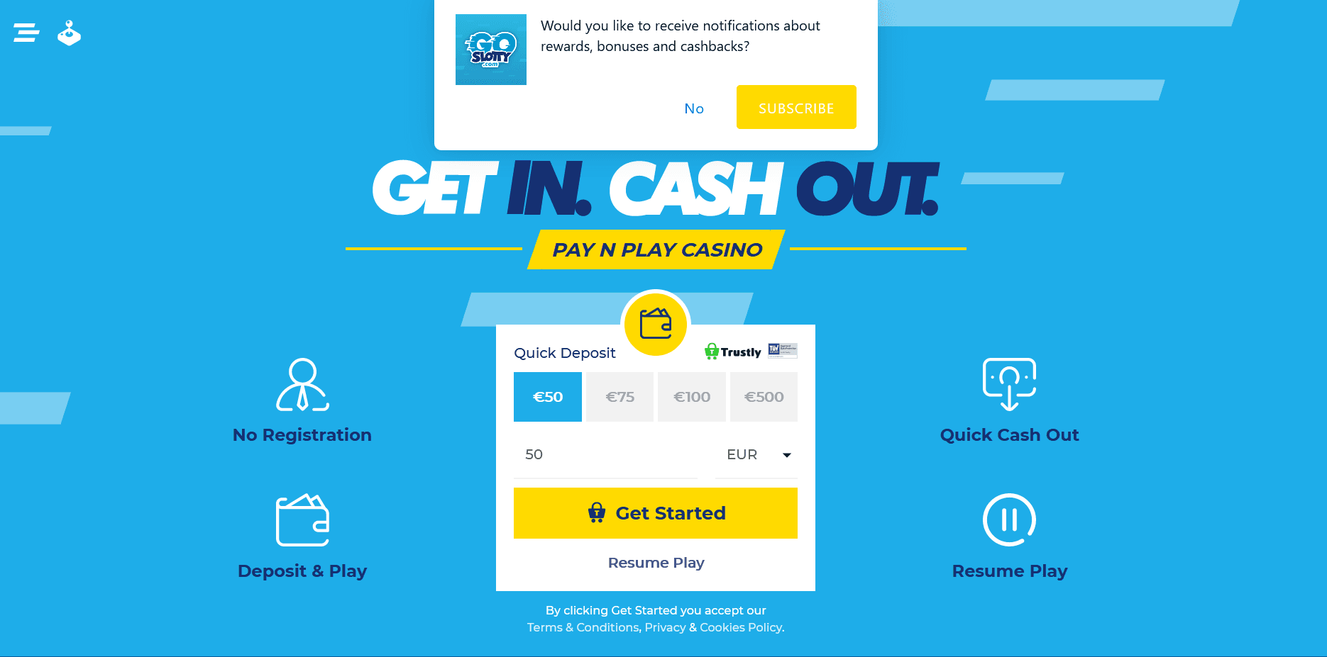 Go Slotty Casino is a new online gambling site that wants all players to know that things move quickly, efficiently and smoothly. This no registration account can help you get started in no time. No need to spend minutes filling out registration forms. Thanks to payment method Trustly, can help you get started in an instant, eliminating the need to register for an account.