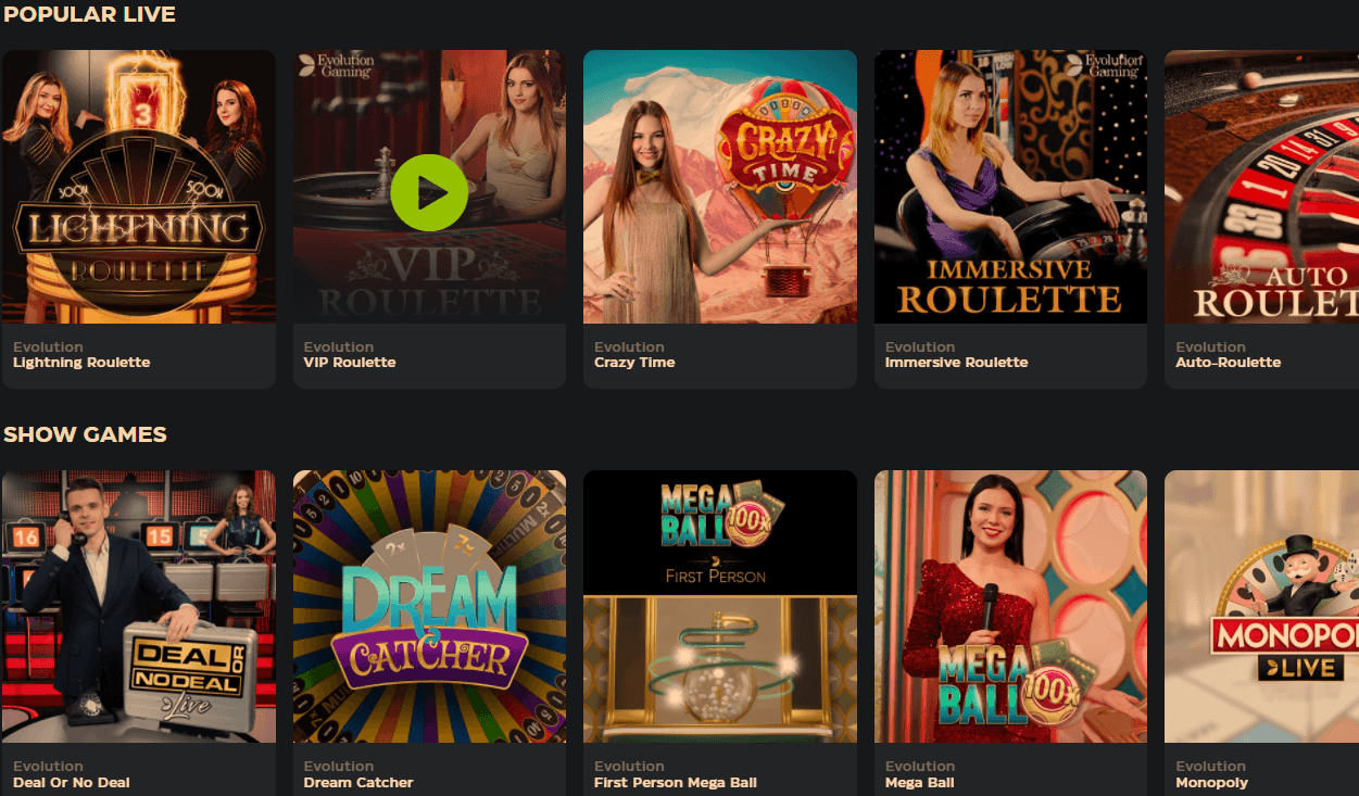 The live section is powered by Evolution Gaming and features games such as Live Blackjack, Roulette, Poker and Baccarat. There are also numerous live game shows available.