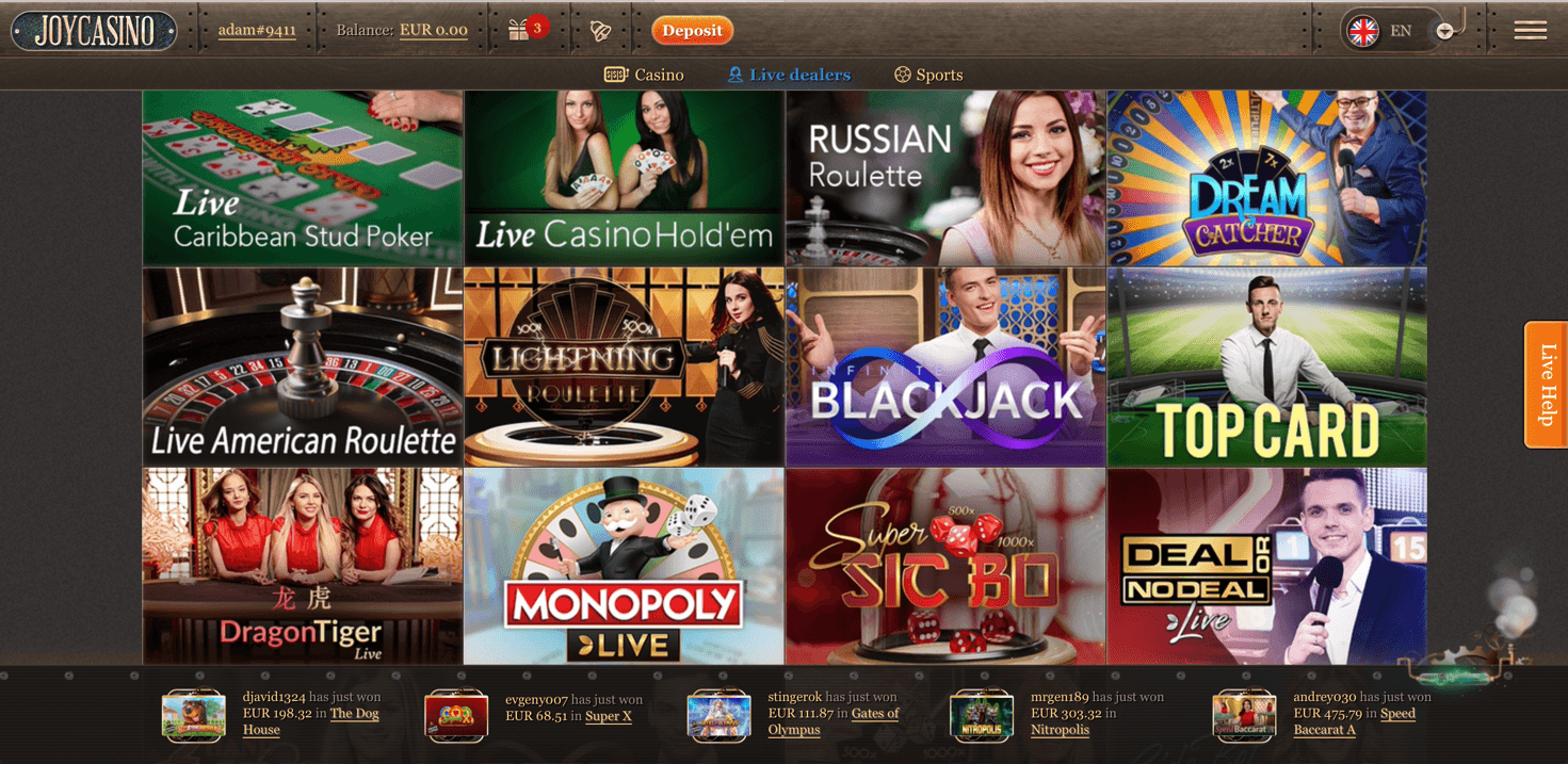 At Joy Casino you will find a decked out live dealer lobby that offers blackjack, roulette, poker, baccarat, game shows and other live games.