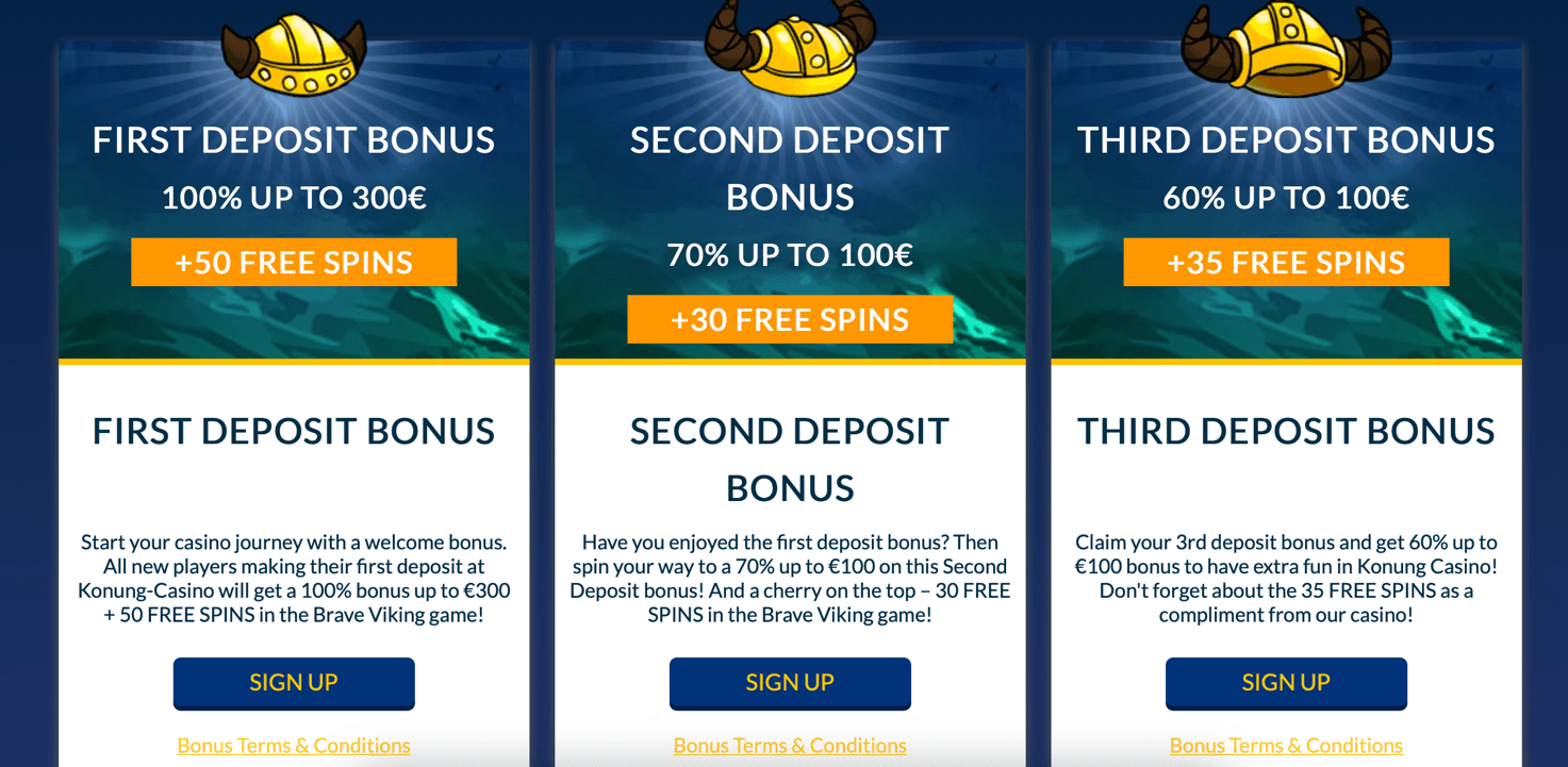 Konung Casino gets new players started with a welcome bonus on your first three deposits. The first deposit gets you a 100% bonus of up to 300 euros and 50 free spins on the “Brave Viking” game. The bonus must be wagered a total of 49 times before the bonus funds convert to real cash. Here’s a breakdown of the three welcome packages.