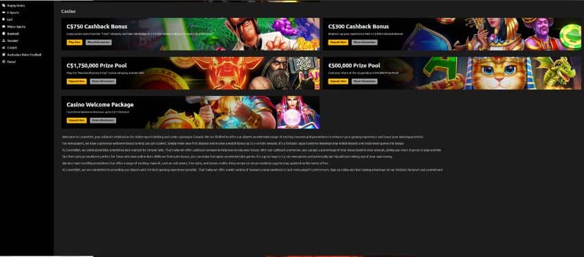 The bonuses offered at LoonieBet Casino are a welcome package, cashback, deposit bonuses, and sportsbook rewards.