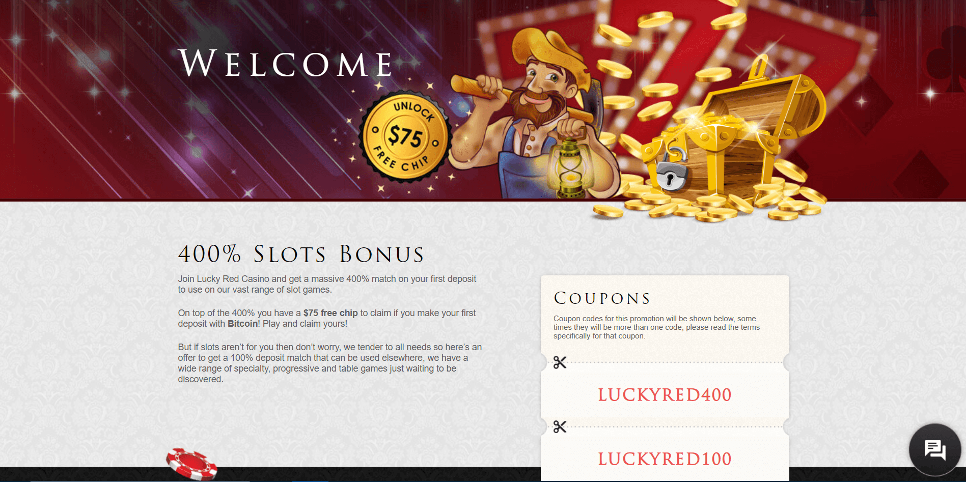 - Use the right coupon: LUCKYRED400 for the 400 euros bonus for slots, and LUCKYRED100 for the 100 euros bonus for other games.