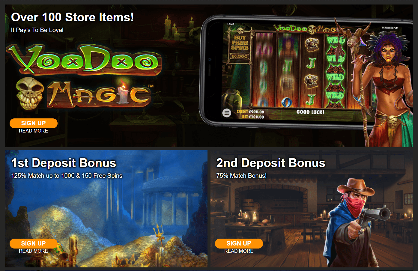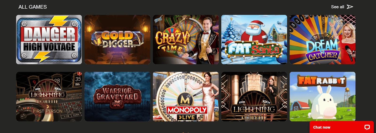 On the top part of the screen, you’ll find some buttons which work as shortcuts for the website categories. Underneath “Home,” “Promotions,” “Casino,” “Live Bets,” and the language button, a few banners appear on a loop, presenting the best current bonuses, free spins, and cashback offers.