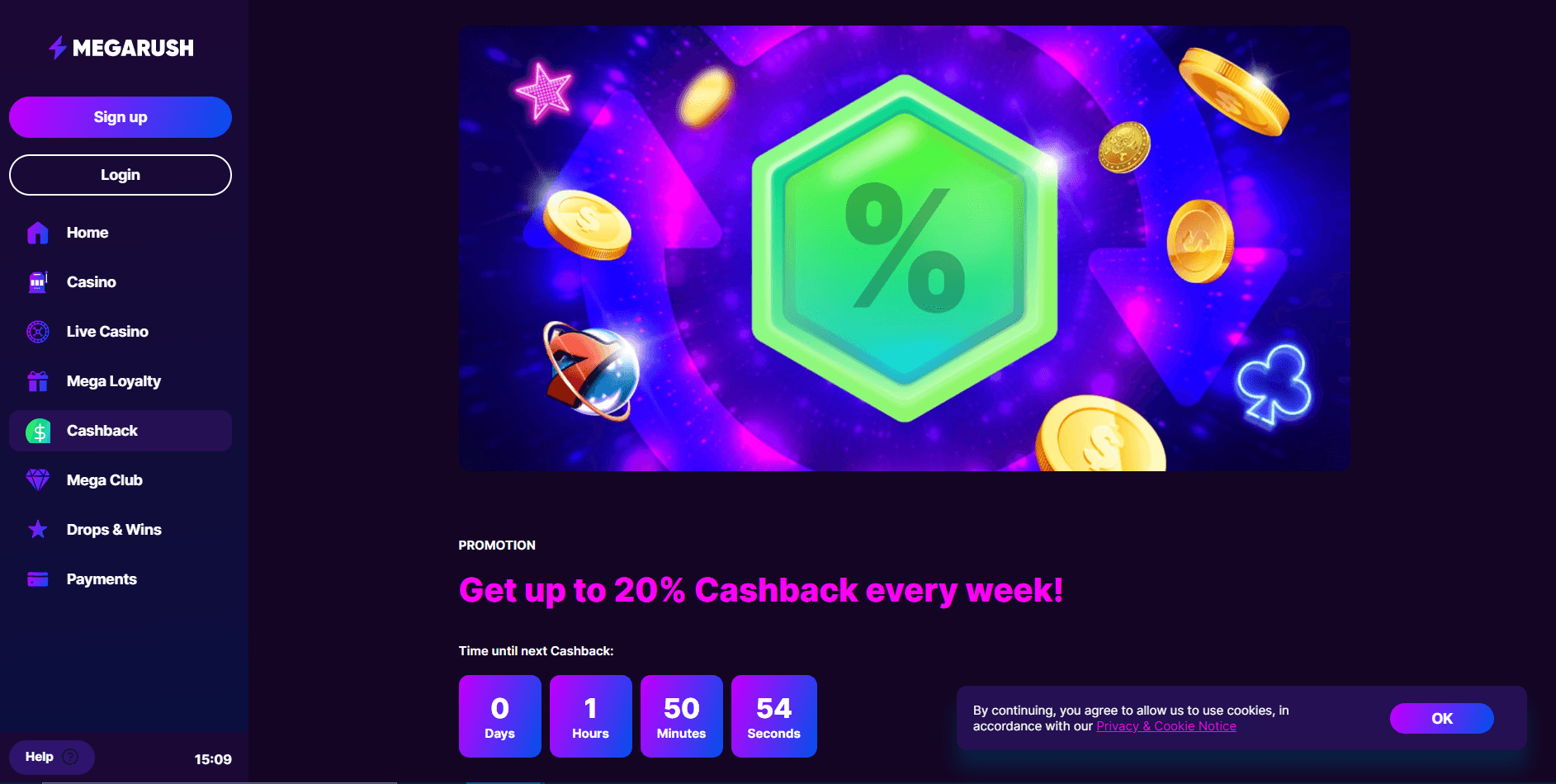 As an existing customer, you can take advantage of the Megarush cashback bonus: a 20% cashback bonus that you can claim every week. However, the bonus is only available if your bets resulted in a loss. This bonus is paid out every Thursday, and the amount of the cashback bonus depends on your losses.