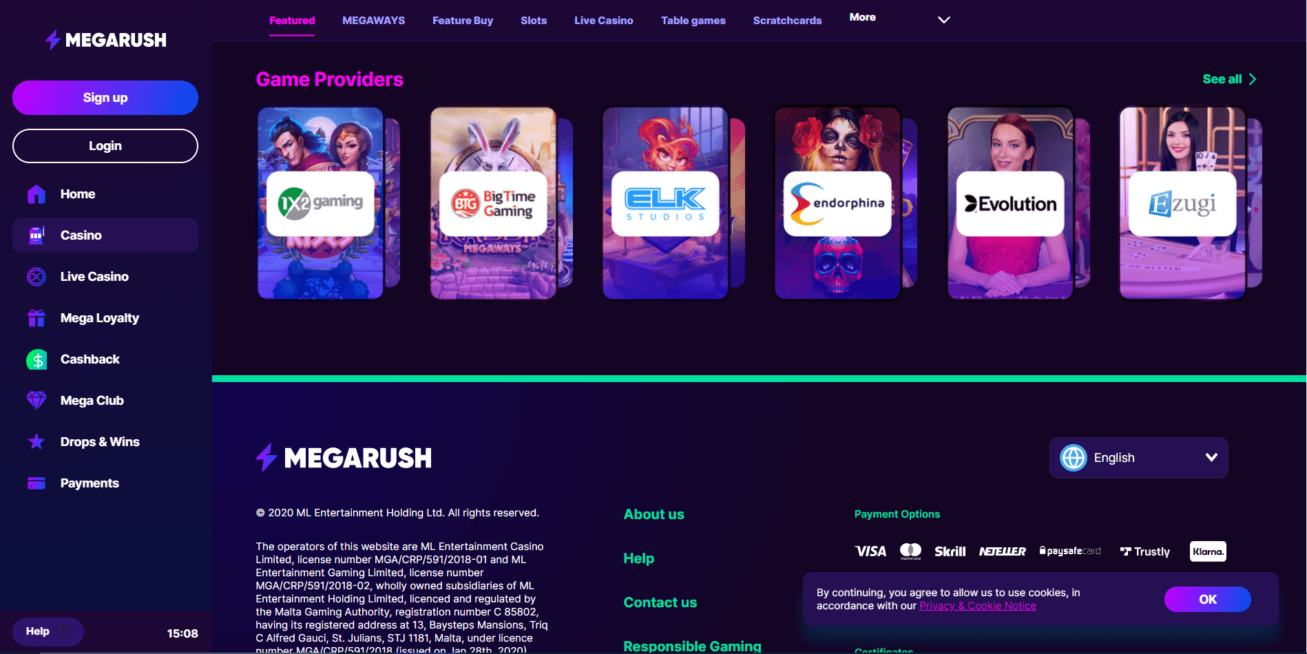 Megarush works with numerous software providers, such as Microgaming, NetEnt, Evolution and many more.