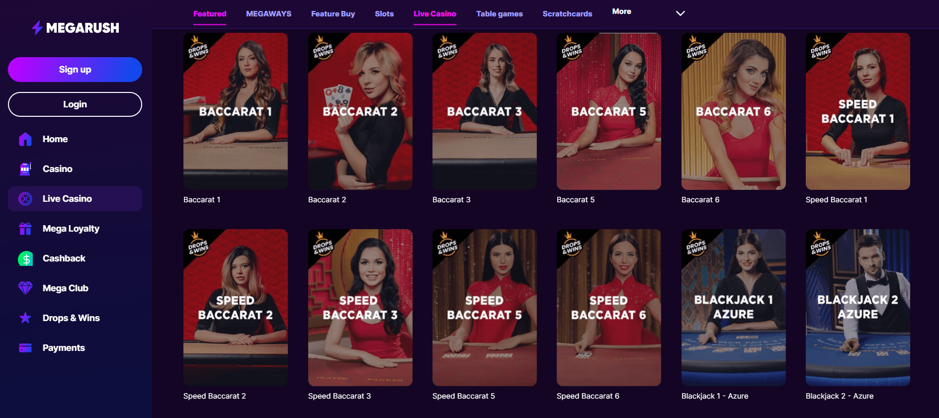 On Megarush Casino, you’ll be able to play tens of live games, including blackjack, poker, roulette and many more.