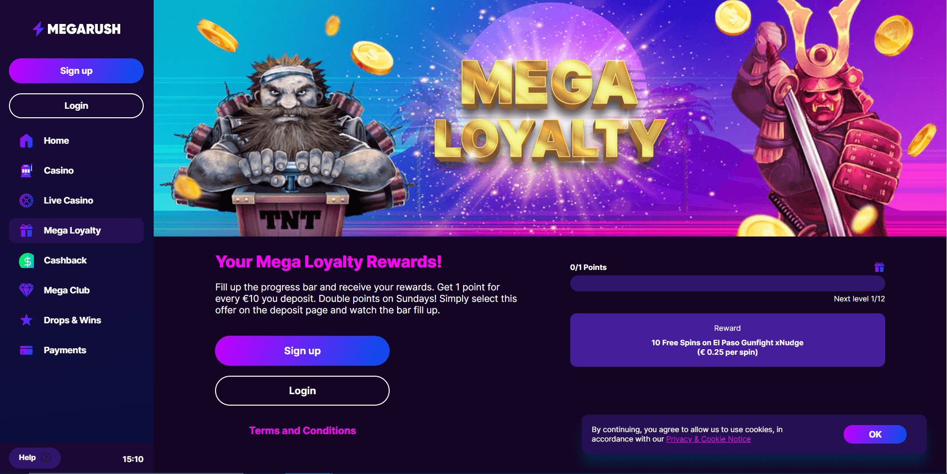 At Megarush Casino, there is a loyalty or VIP program called Mega Loyalty and Mega Club. The former is a 12-stage VIP program, with a bonus at every level. You’ll find a whole range of loyalty rewards for existing customers, which players usually value a lot.