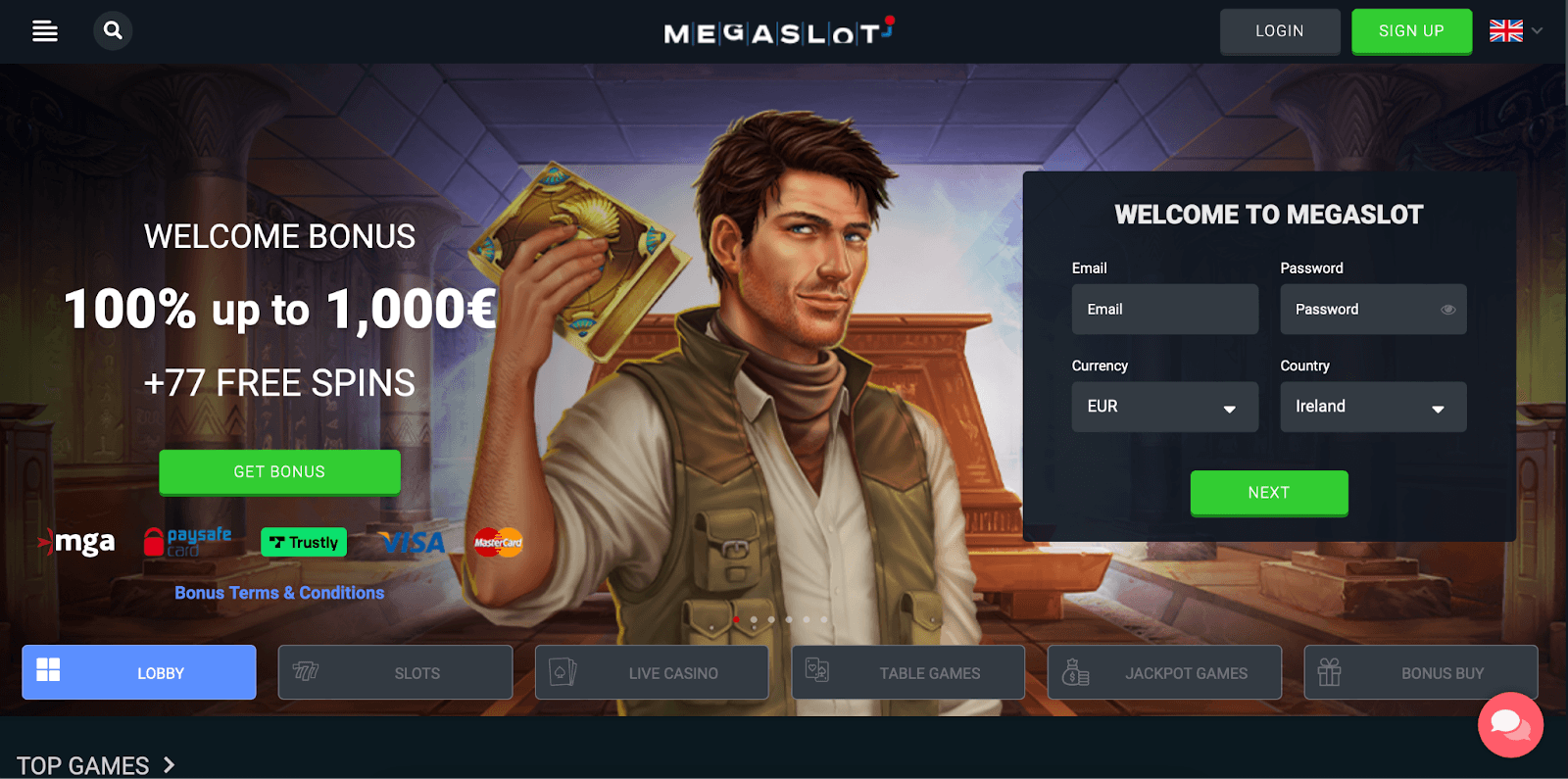 New players to Mega Slot Casino can claim a 100% bonus worth up to 1,000 euros and 77 free spins on their first deposit.
