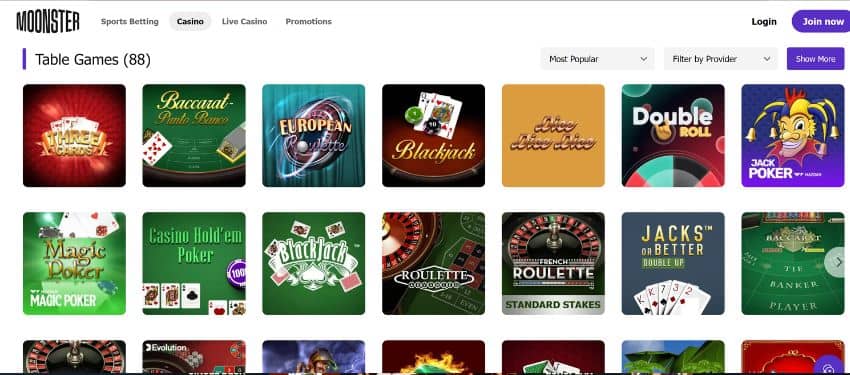 Providers like Evolution Gaming, Ezugi, and other reputable companies power the table games at Moonster. Some games in this category include "Joker Poker," "Double Roll," "European Roulette," and "Classic Blackjack."
