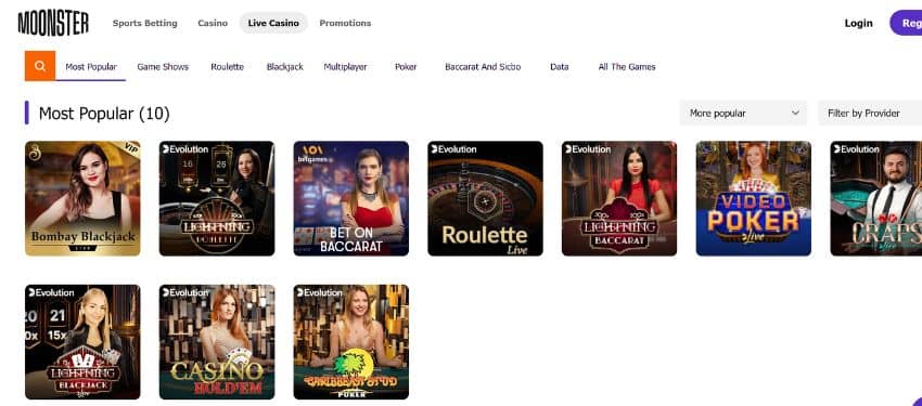 The games in the Moonster live dealer segment are Bet On Baccarat, Bombay Live Blackjack VIP, and Wheel of Fortune.