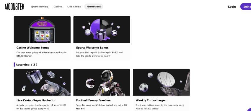 At Moonster, you have a few one-time welcome offers for casino and sports betting players. There are also recurring bonuses to keep the adventure going, giving you an extra boost on days when funds are low.