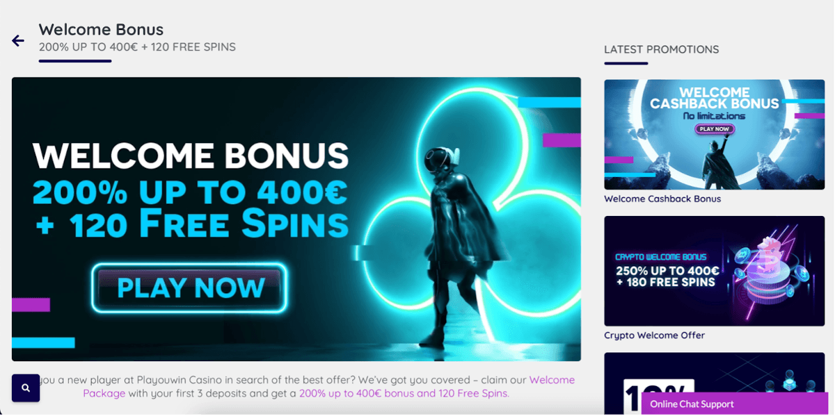 PlaYouWin Casino gets news players off to a winning start with a welcome bonus worth up to 400 euros. The welcome package is spread across the first three deposits, with the first deposit getting you double back up to 150 euros and 40 free spins on “Starburst Xxxtreme”.