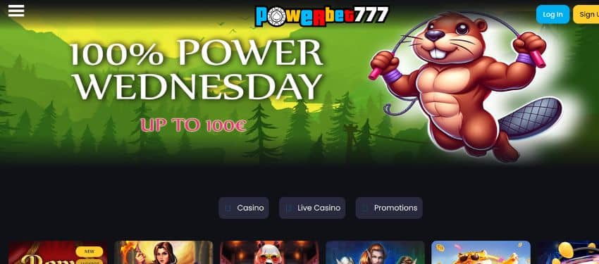 Powerbet777 casino welcome page showing an animated background with trees, a beaver and the Wednesday bonus offer.