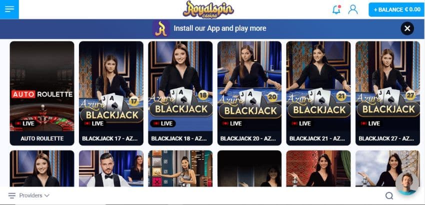 RoyalSpin Casino has no separate section for table games. All the table titles, including roulette, blackjack, baccarat and poker, are offered as live casino games.