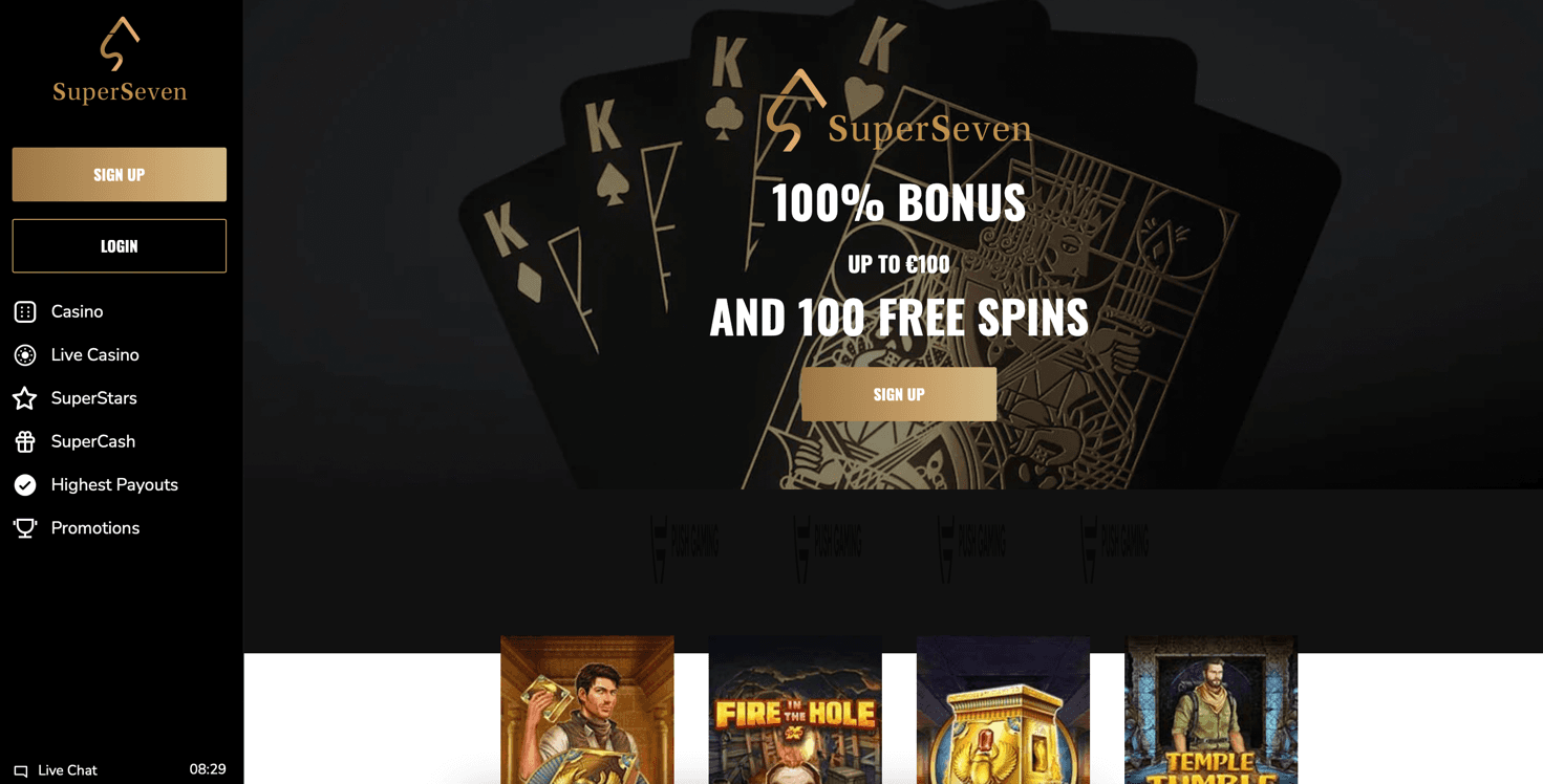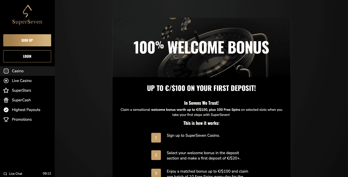 New players to Super Seven Casino can claim a 100% bonus worth up to 100 euros and 100 free spins on their first deposit.