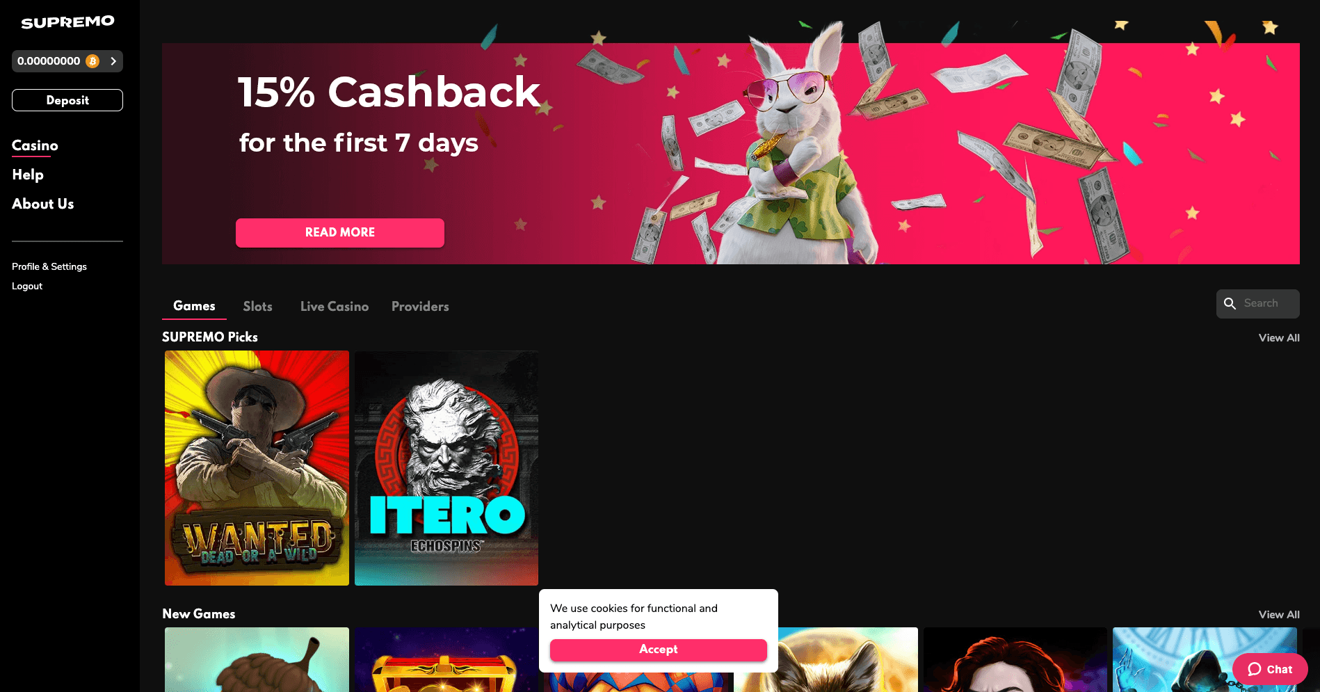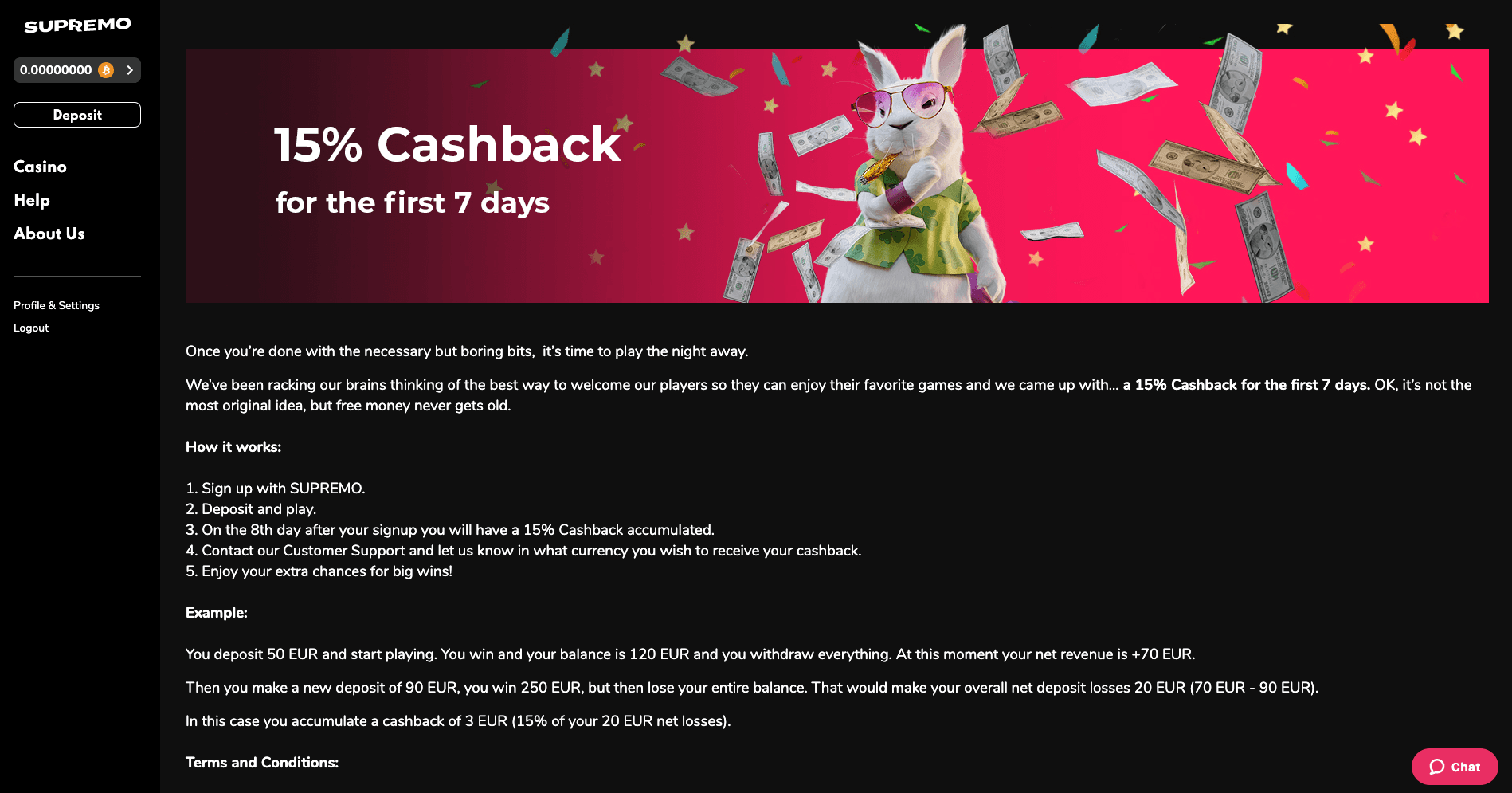 Supremo Casino offers a splendid 15% cashback for the first seven days after you've signed up to the casino. How does that work? Easy! Sign up with Supremo, deposit and play your favorite games. On the eight day after you signup, you'll receive 15% of the losses accumulated back. Remember to contact customer support to let them know which currency you'd like your cashback in.