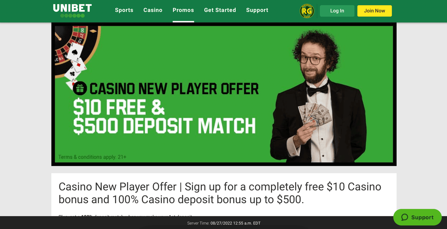 When you sign up as a new player to Unibet Casino, you can grab a free 10-dollar bonus just for registering your details. When you are ready to make your first deposit, you can claim a 100% bonus worth up to 500 dollars.