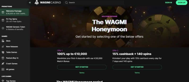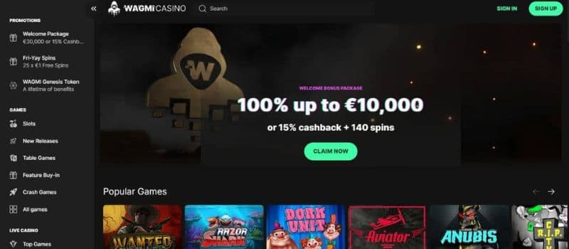 The welcome bonus at Wagmi Casino is worth a 100% up to €10,000 or 15% cashback + 140 spins.
