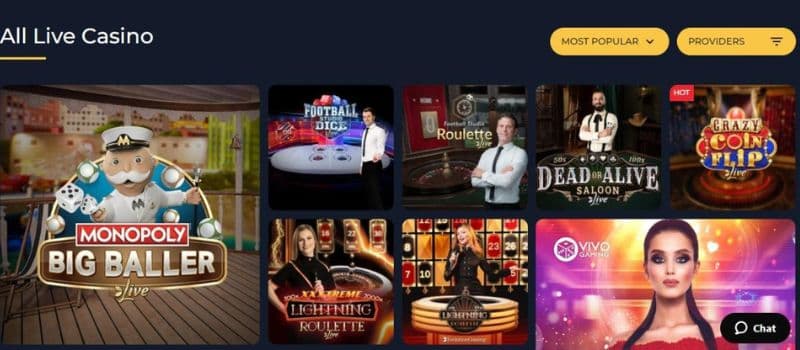 Winscore's live section has games like Monopoly Big Ball, Dead or Alive Saloon, XXXtreme Lightning Roulette, Free Bet Blackjack, Bac Bo and many more.