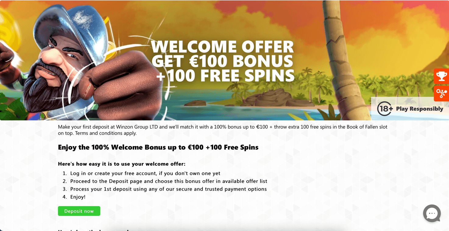 New players to Winzon Casino can claim a 100% bonus worth up to 100 euros and 100 free spins on their first deposit. You can also claim a bonus on your second, third and fourth deposits.