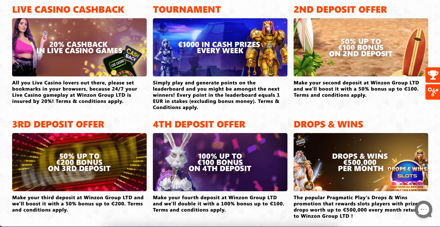 Aside from a four-part welcome package, at Winzon Casino you will get to enjoy regular promotions, extras, and tournaments.
